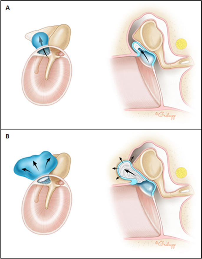 Graphic representation of typical cholesteatoma progression in the middle ear space, beginning with (A) attic retraction pocket of the pars flaccida portion of the tympanic membrane followed by (B) gradual progression into the middle ear and mastoid space with erosion of ossicles and potentially other bony structures as well. Of note, cholesteatoma can also commonly be acquired from a tympanic membrane perforation, or may also be congenital in origin. Illustration Chris Gralapp3.